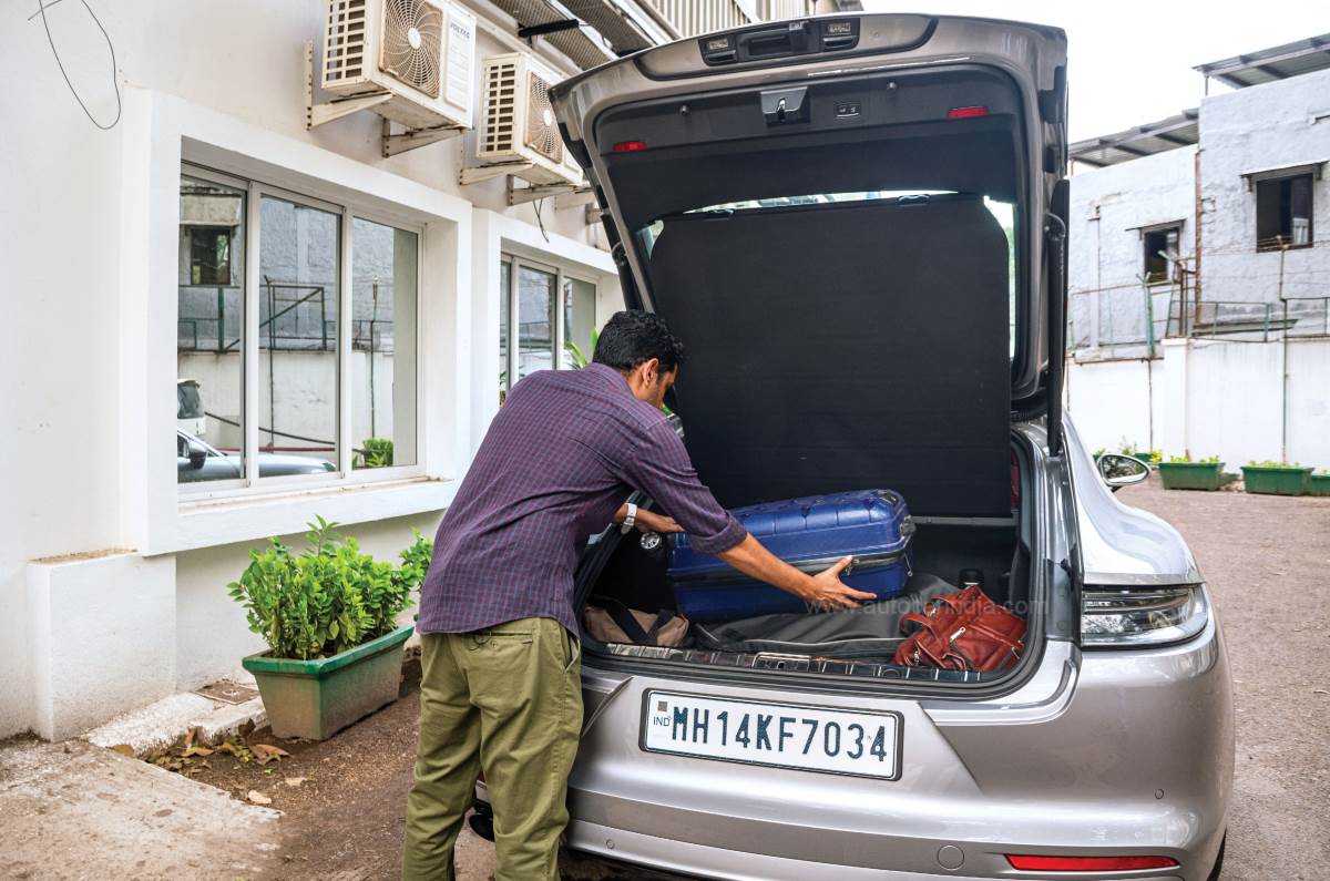 Before we’ve turned a wheel, I’ve had to concede a point, and one I didn’t expect to. The Panamera’s liftback boot is a sizeable 467 litres compared to the Taycan’s 400-litre sedan rear boot. But since both house a spare tyre on the boot floor, fitting a big suitcase is easier in the Taycan, owing to its squarer shape. It fouls with the Panamera’s sloping rear glass, but with a bit of luggage Tetris, we are able to fit it in.