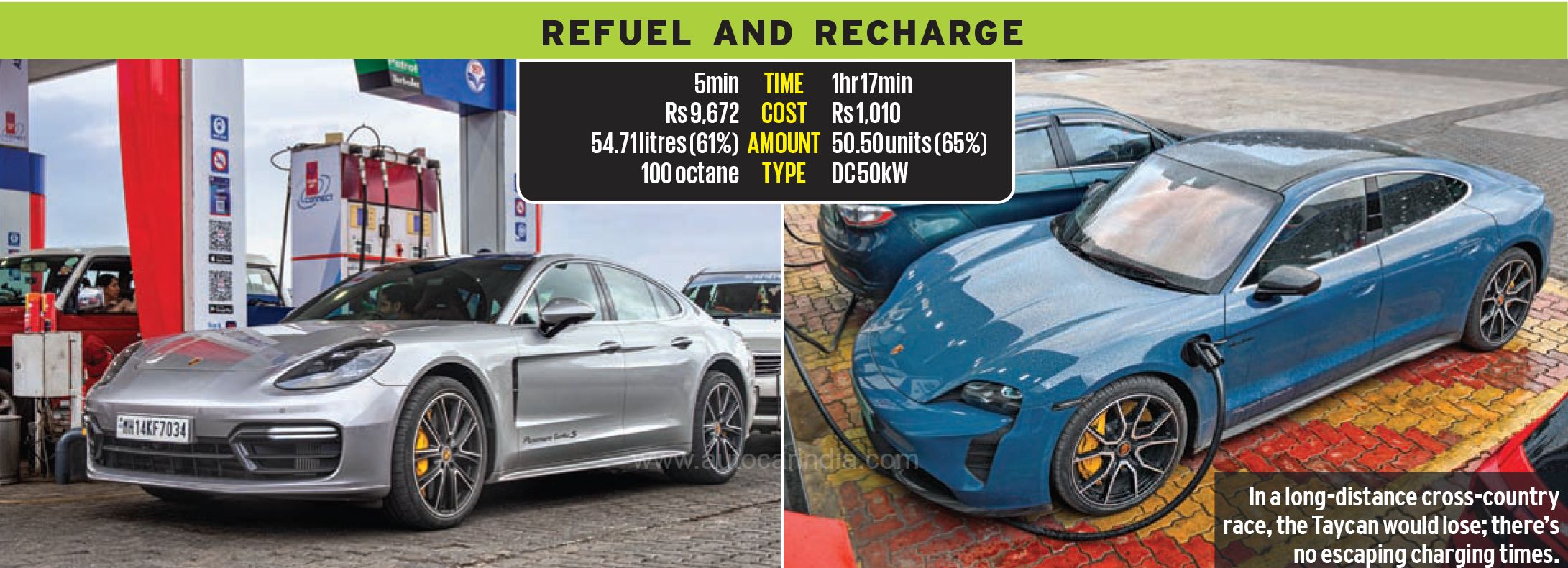 But that’s exactly what I set out to do here; put the spotlight back. And I wanted to do this with a long drive between cities, through highways, mountain roads and a bit of gnarly traffic for good measure. Trouble is, my colleagues felt the Taycan should come along for the ride, just to keep it honest. Reluctant as I am to let silly comparisons get in the way of my ode to the Panamera, they do have a point. Both wear the Turbo S badge, an honour bestowed on only the fastest Porsches, both cost around Rs 2.4 crore (ex-showroom) before options, and yes, despite their drastically different power units, they both have the same job description.Â