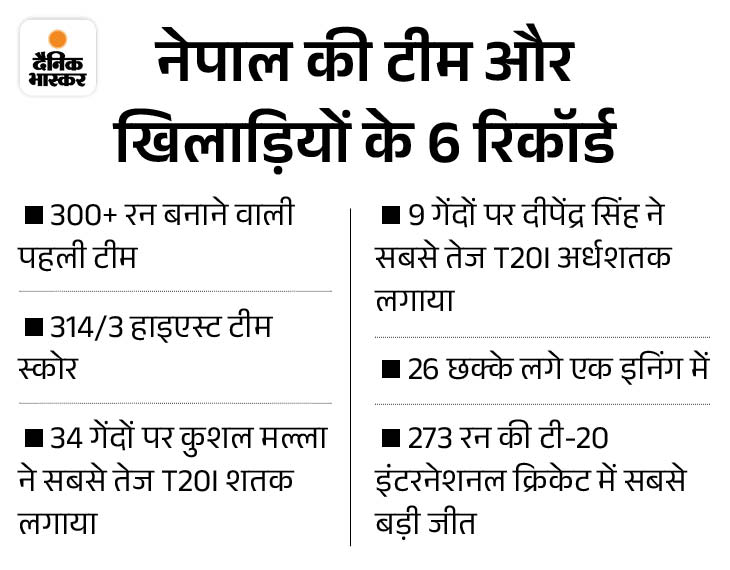 Nepal scored 314 runs against Mongolia. Before this, no team had scored 300+ in T20 International. Earlier, the record in T-20 and T-20 International history was in the name of Afghanistan, who had scored 278 against Ireland in Dehradun.
