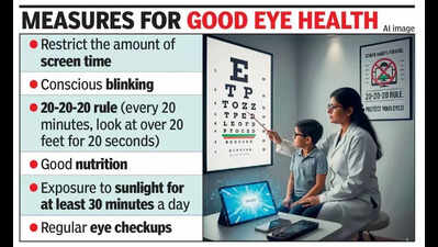 Bengaluru: If your child is doing homework on tablets, playing games on computers, and scrolling on mobile phones, take immediate measures to reduce their screen time, say ophthalmologists in Bengaluru. Cases of myopia (nearsightedness) and dry eye syndrome are steadily rising among children.Myopia is now being considered a global epidemic. According to doctors, the excessive use of screens that began during the Covid-19 pandemic placed severe strain on children’s eyes, resulting in these conditions. Eye hospitals this year are recording at least 30–90 cases of myopia and dry eye syndrome in children every month. For most, the first signs appear when children are unable to see the classroom board clearly.“Pre-pandemic, we used to see two to three cases of dry eyes or myopia among children in a month. But post-pandemic, we see at least 10–16 cases. Immediately after the pandemic, we were seeing five to eight cases every week,” said Dr Naren Shetty, head of the department of cataract and refractive lens services and director at Narayana Nethralaya.Screen time has become unavoidable for children. Dr Vidhya C, consultant, paediatric ophthalmology, Strabismus, and neuro-ophthalmology, Sankara Eye Hospital, said, “Even in schools, they are spending less time outdoors. There is an increase in awareness too as parents bring their children for routine checkups, resulting in early diagnosis of myopia.”Along with increased screen time, other contributing factors include nutritional deficiencies, lack of sunlight exposure leading to Vitamin D deficiency, and even extensive reading. A study conducted by Narayana Nethralaya after the pandemic highlighted lower dopamine levels increased the chances of developing or worsening myopia. “We conducted a dopamine test on tears in the eye and found that kids who were engaged in outdoor activities for more than two hours a day had higher levels of dopamine and were less likely to see progression of myopia,” Dr Naren said.Treatment options for myopia and dry eyes have evolved with the establishment of dedicated clinics and technological advancements. “Previously, when it was myopia, children were just given glasses and myopia would continue to increase. But now we have specific treatments like low-dose atropine drops and lenslet glasses, which create a peripheral defocus to prevent myopia from progressing,” said Dr Sri Ganesh, chairman and MD of Nethradhama Hospitals.Doctors also note increasing numbers of children being diagnosed with cataracts and squints too. “We see juvenile cataract which develops at the age of four or five, which may be due to nutritional deficiencies. The detection of squint eyes has also increased due to screening in schools and preschools. These conditions can be corrected and earlier the treatment, the better. Up to the age of six, squints can be corrected, and kids can even develop binocular vision unlike adults for whom it will just be a cosmetic procedure,” Dr Sri Ganesh said.Measures for good eye health– Restrict the amount of screen time– Conscious blinking– 20-20-20 rule (every 20 mins, look at more than 20 feet for 20 seconds)– Good nutrition– Exposure to sunlight for at least 30 minutes a day– Regular eye checkups