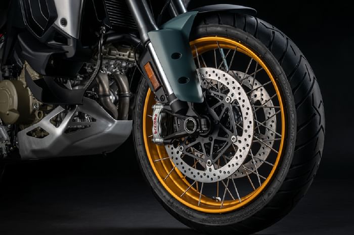 Suspension is handled by semi-active Marzocchi units controlled by the brand’s Adaptive Ducati Skyhook Suspension (DSS) EVO system that has been retuned for the V4 Rally. The system lets you adjust the suspension on the move and also analyzes road conditions and riding style, automatically adjusting compression and rebound damping.